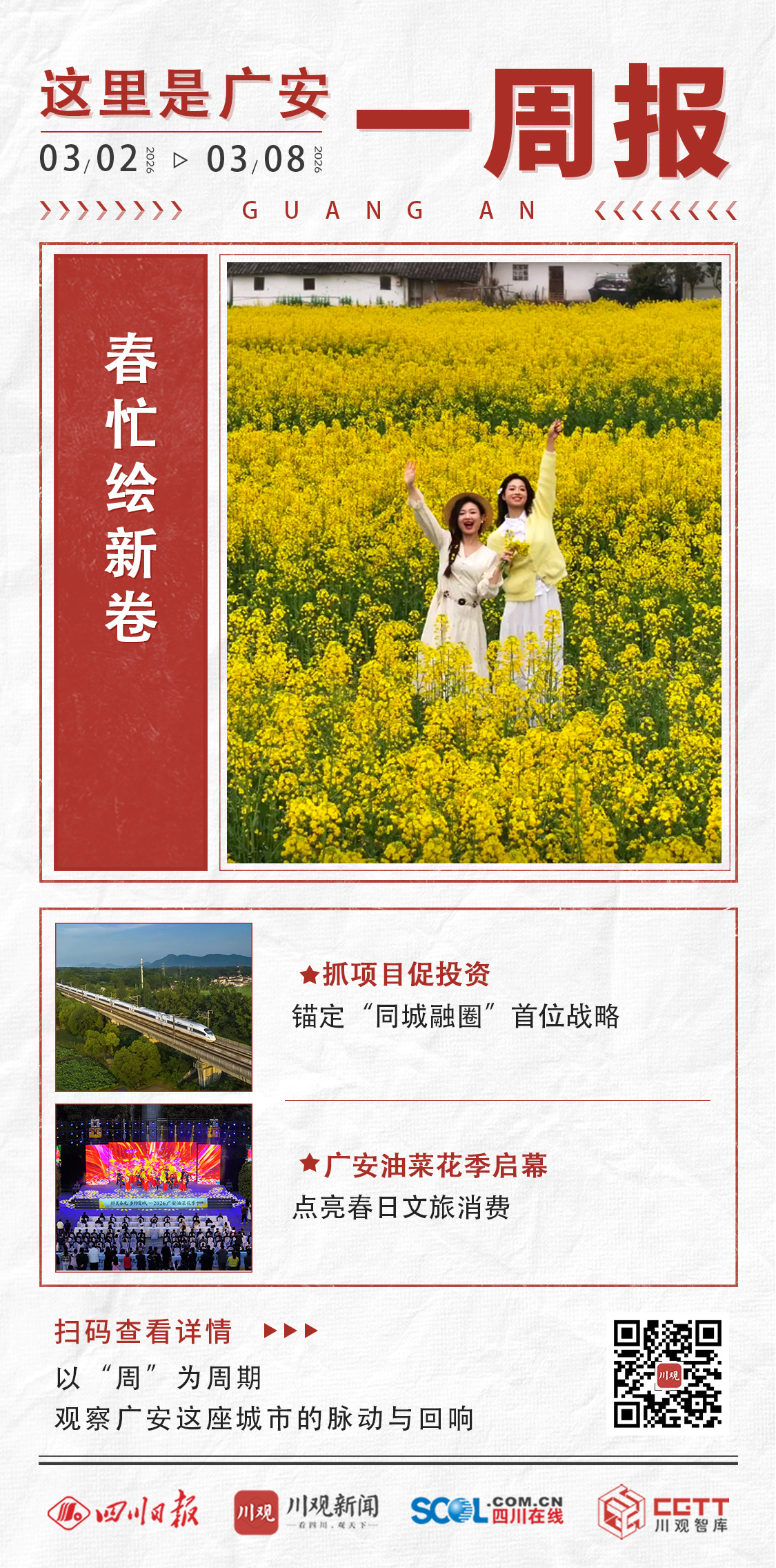 一年之计在于春,奋进实干正当时。本周(3月2日至3月8日),从“促”发展到“谋”长远,广安紧扣一季度“开门红”目标,聚焦同城融圈、春耕保粮、文旅消费等重点,全市上下发展态势稳中有进出。