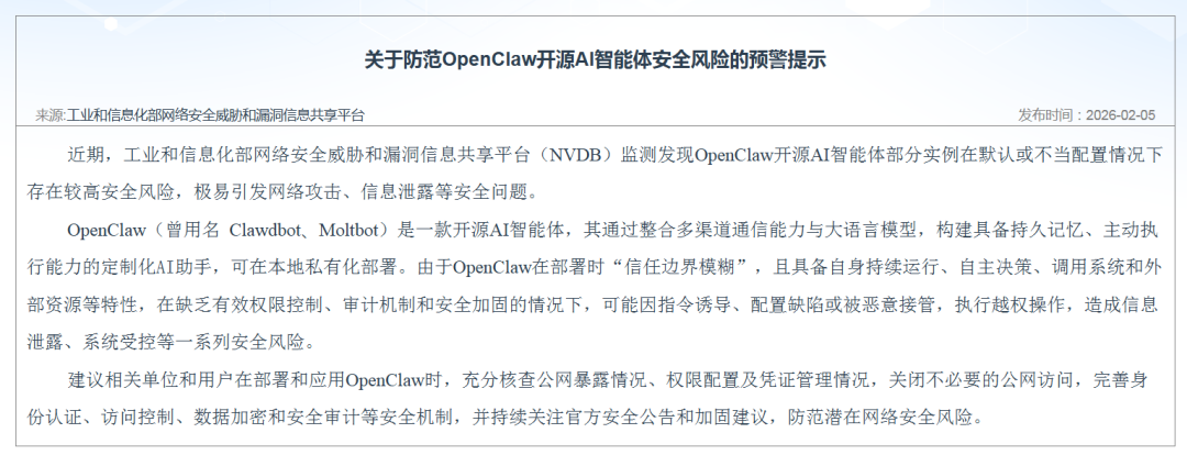 值得留意的是,早在一个月前,工业和信息化部网络安全威胁和漏洞信息共享平台发布《关于防范OpenClaw开源AI智能体安全风险的预警提示》称,监测发现OpenClaw开源AI智能体部分实例在默认或不当配置情况下存在较高安全风险,极易引发网络攻击、信息泄露等安全问题。