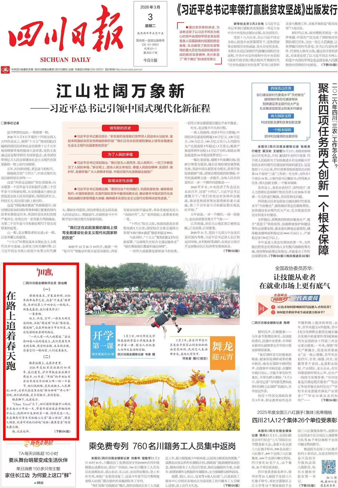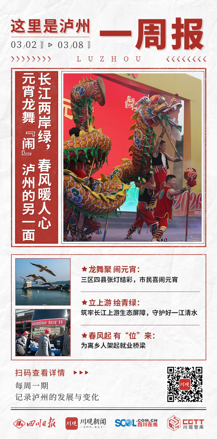 进入三月,泸州大地涌动着热闹、奋进与温暖的气息。3月2日至8日,从热闹非凡的元宵民俗盛宴,到长江生态屏障的绿意盎然,再到暖人心扉的“春风行动”送岗......