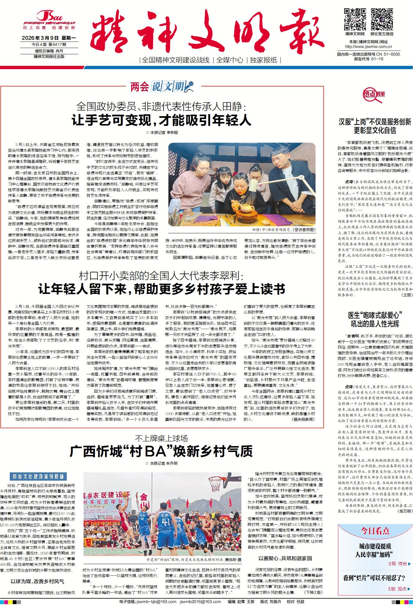 3月5日,在北京召开的全国两会上,第十四届全国政协委员、建水县紫陶技能传习中心理事长、国家级非物质文化遗产代表性项目建水紫陶烧制技艺云南省级代表性传承人田静,带来了关于非遗传承与发展的新思考。同日,河南安阳内黄县马上乡李石村村口小卖部的老板李翠利,以全国人大代表的身份走进人民大会堂,她在乡村小卖部里办起“微光书苑”的故事,为乡村文化人才队伍建设提供了生动注脚。请关注今日1版《两会说文明》,看代表委员们关于“非遗传承与发展”“乡村文化人才队伍建设”的建议。