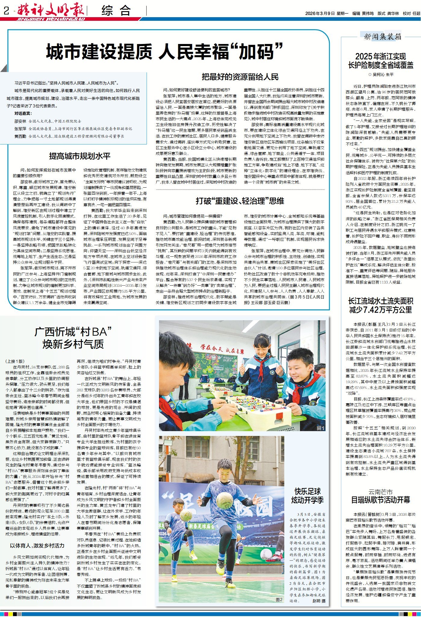 习近平总书记指出:“坚持人民城市人民建、人民城市为人民”。城市是现代化的重要载体,承载着人民对美好生活的向往。如何践行人民城市理念,提高城市规划、建设、治理水平,走出一条中国特色城市现代化新路子?请看今日2版头条3位代表委员给出的建议。