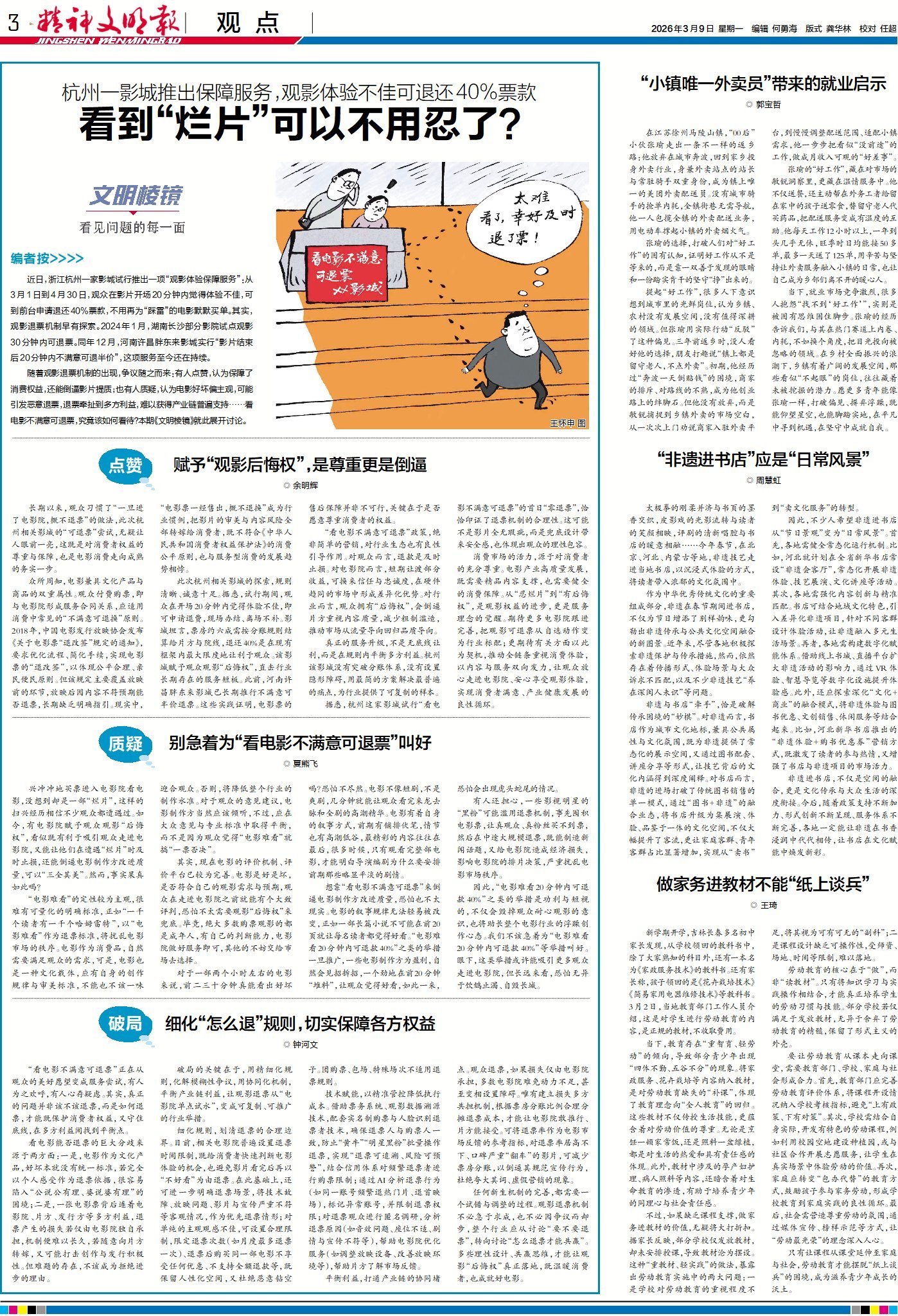 近日,杭州一影城推出新举措:观众在影片开场20分钟内觉得体验不佳,可申请退还40%票款,不用再为“踩雷”的电影买单。争议随之而来:有人点赞,认为保障了消费权益,还能倒逼影片提质;也有人质疑,认为电影好坏偏主观,可能引发恶意退票,退票牵扯到多方利益,难以获得产业链普遍支持。究竟该如何看待此事?来看本期3版《文明棱镜》的多方观点。