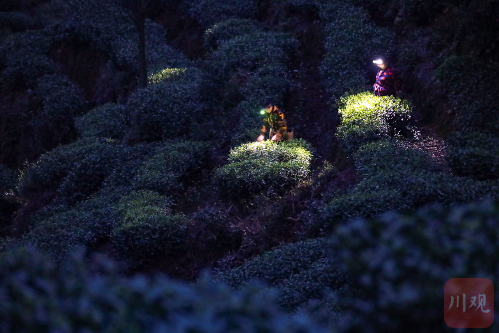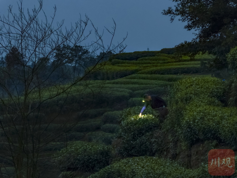 3月7日清晨6时20分许,雅安市名山区红星镇,零星的鸡鸣打破了山村的宁静,朦朦醒的天空开始与漆黑的山峦“分割”,茶山上依稀亮起点点“星光”,茶农们顶着头灯,争分夺秒抢摘新绿。