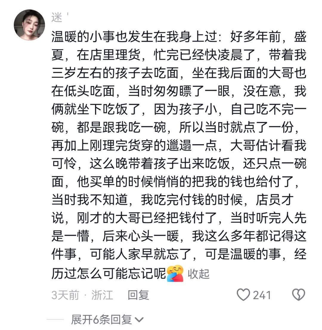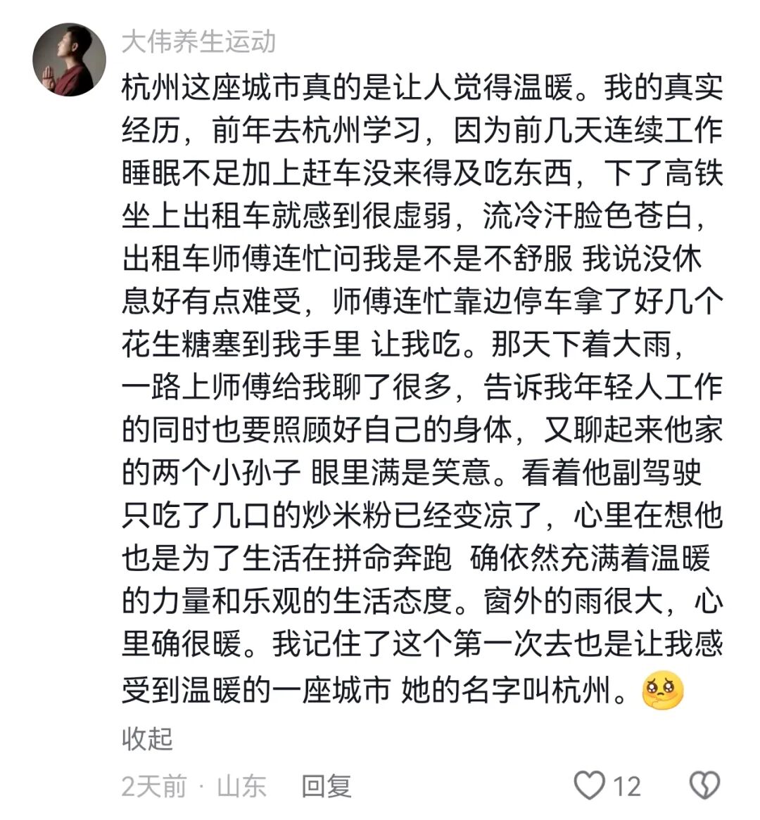 更让张先生觉得感动的是,他的“凌晨被追尾”这事就像一颗投进湖里的小石子,泛起阵阵涟漪,许多网友在评论区分享了自己曾在杭州的碰到过的暖心事,看下来,就像一幕幕电影场景。