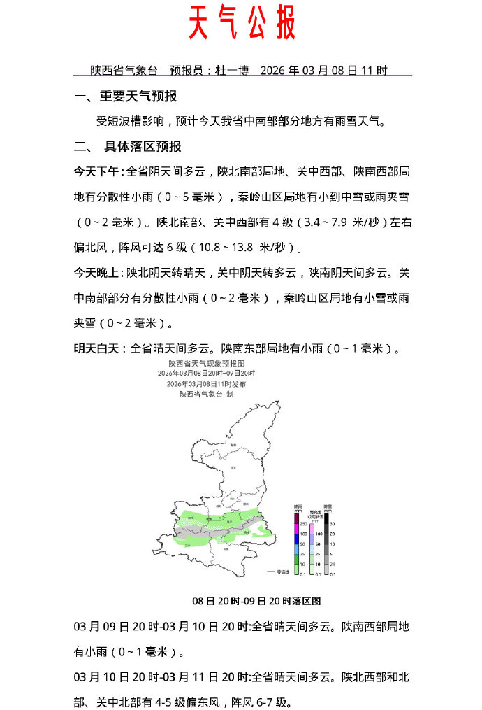 08日:阴天,午后至前半夜有分散性小雨,南部山区有雨夹雪或小雪,3℃~9℃;