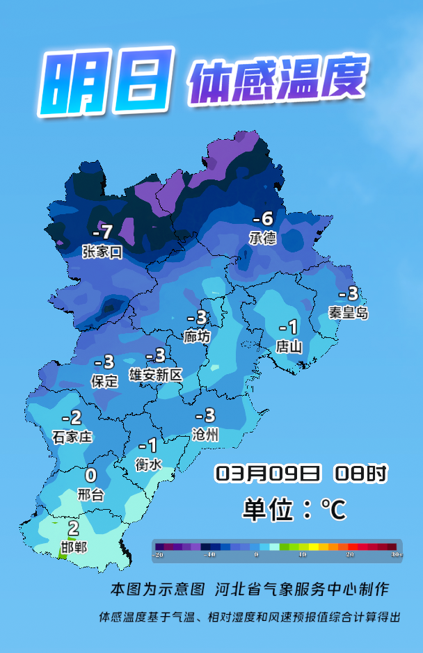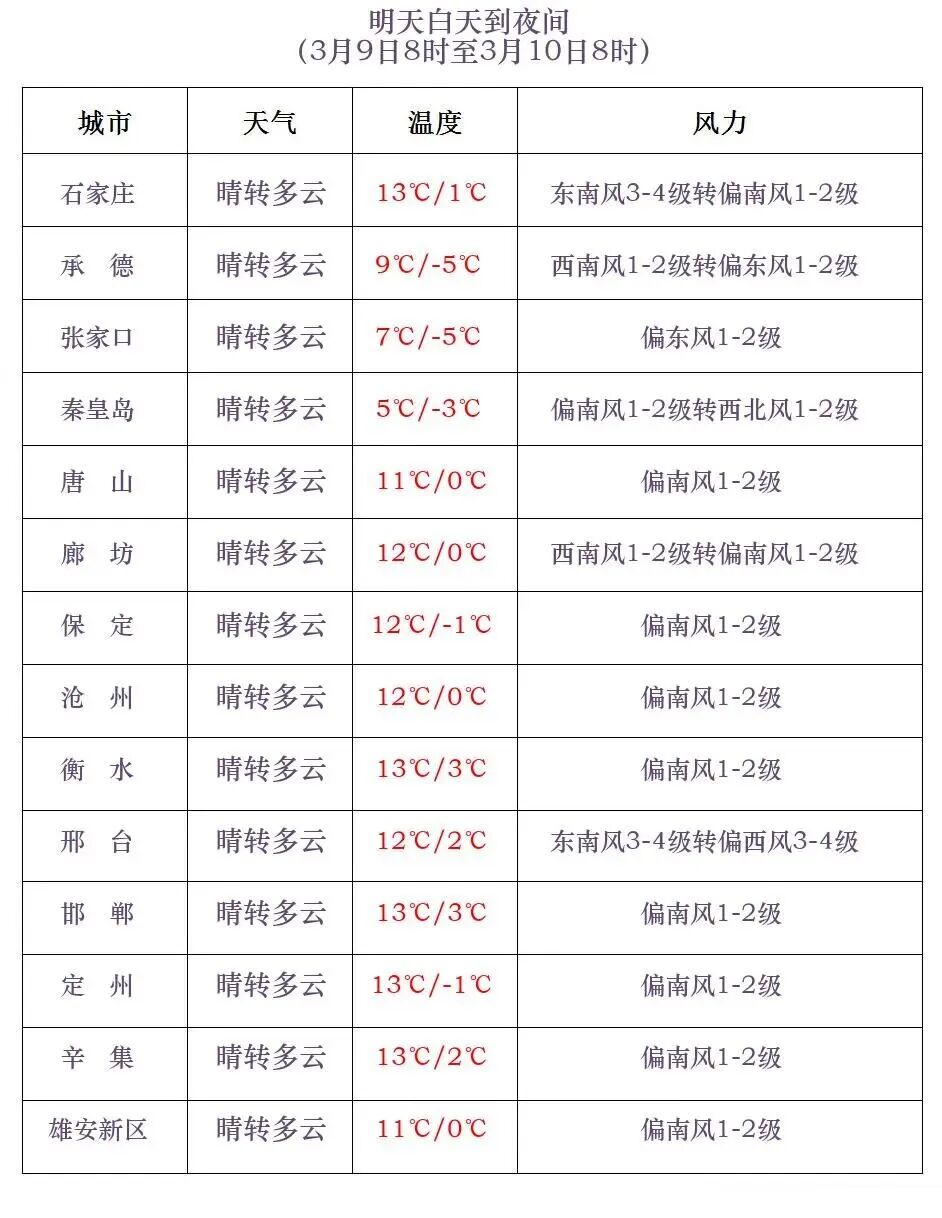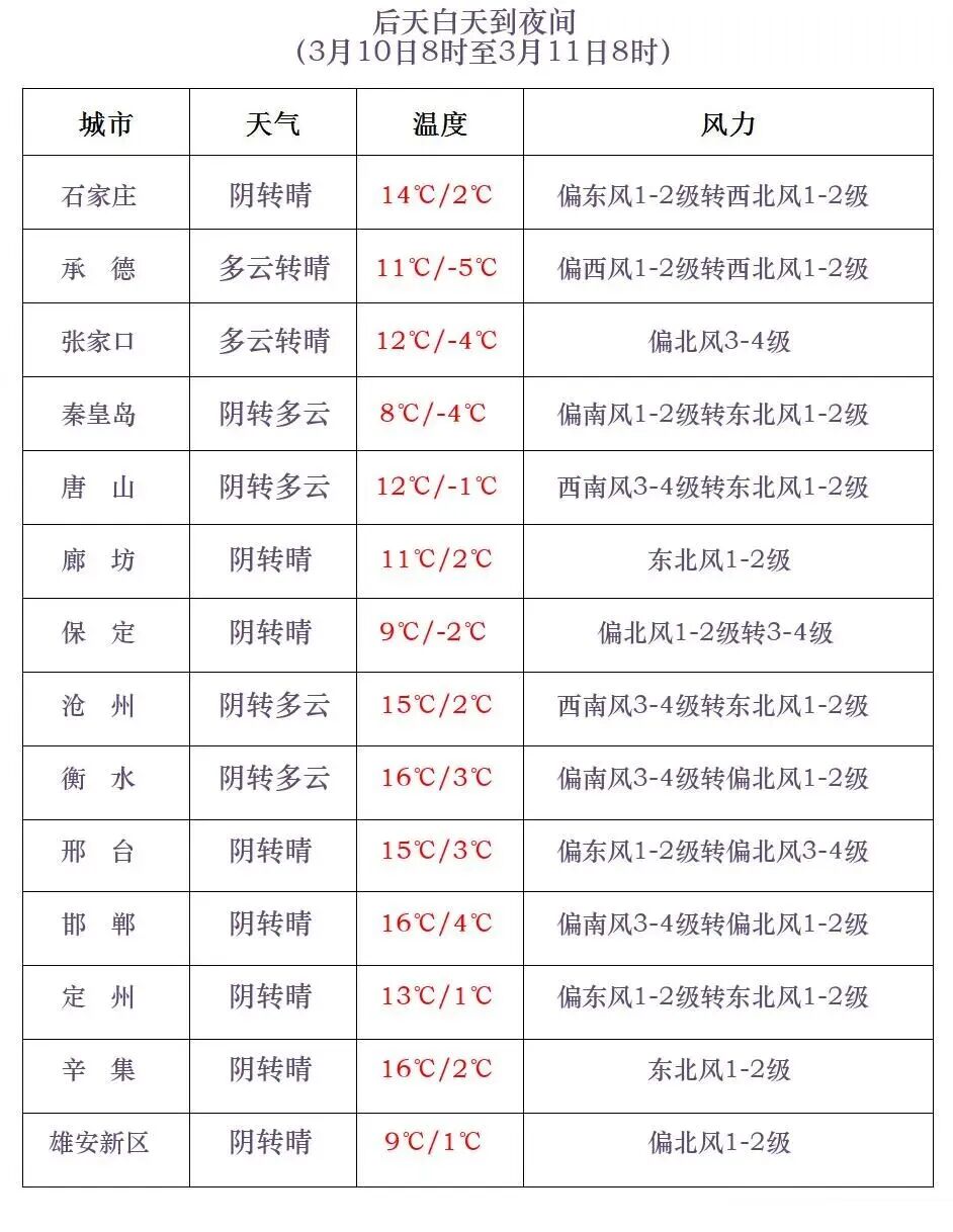 明天夜间到10日,坝上地区阴转晴,其他地区多云转阴,其中唐山南部、廊坊东部、沧州东部有零星雨夹雪。