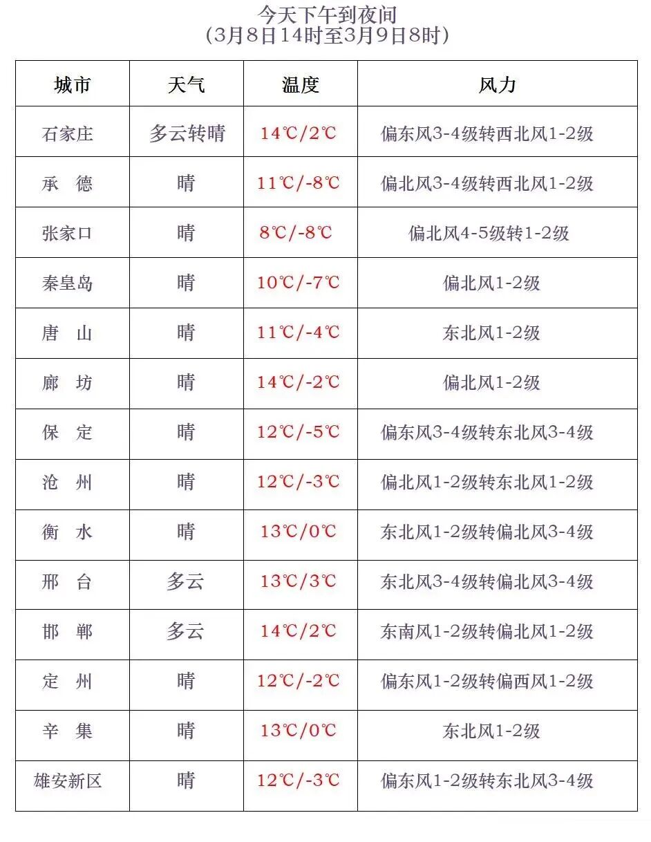 今天白天,张家口、承德西部有北到西北风4到5级,阵风6到7级,局地可达8级。