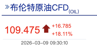 消息面上,中东战事导致石油输出受阻,叠加多个产油国因储油量趋满而被迫减产,国际油价在3月9日亚洲交易时段出现暴涨,截至北京时间9:30,纽约原油价格上涨超20%,报109.67美元/桶;布伦特原油价格上涨18.11%,报109.475美元/桶。此次国际油价突破100美元/桶,为自2022年俄乌冲突爆发以来首次。