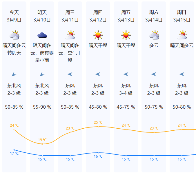 周一(9日)多云转阴天,气温16-24℃;