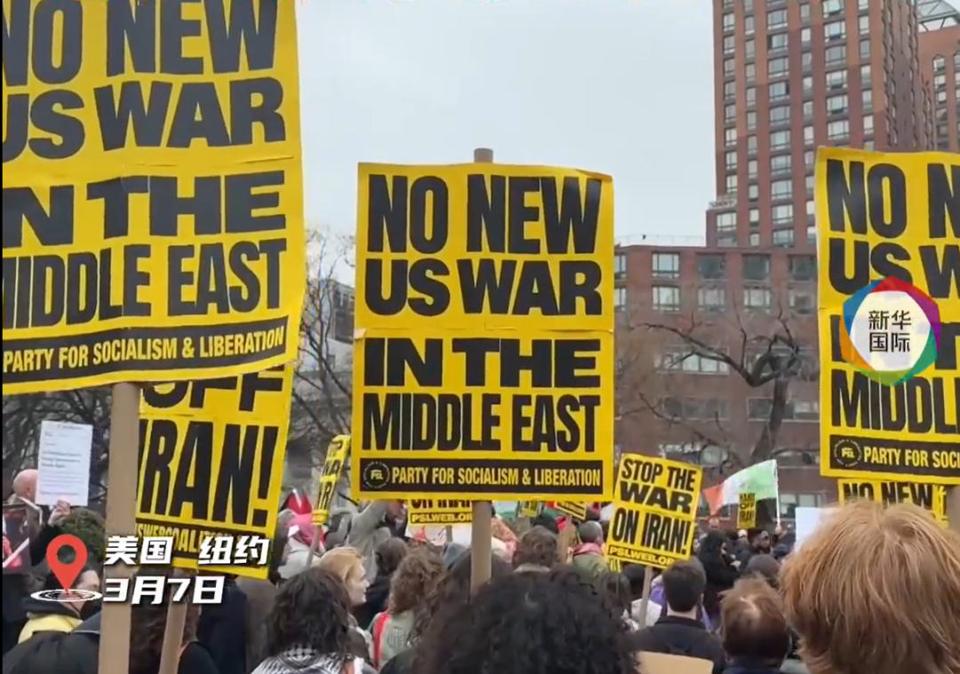 当天,数百名民众聚集在纽约市曼哈顿联合广场,高举伊朗国旗,手持“停止对伊朗战争”“不要插手伊朗”等标语,高呼“当今世界最大的威胁是特朗普和美国”。