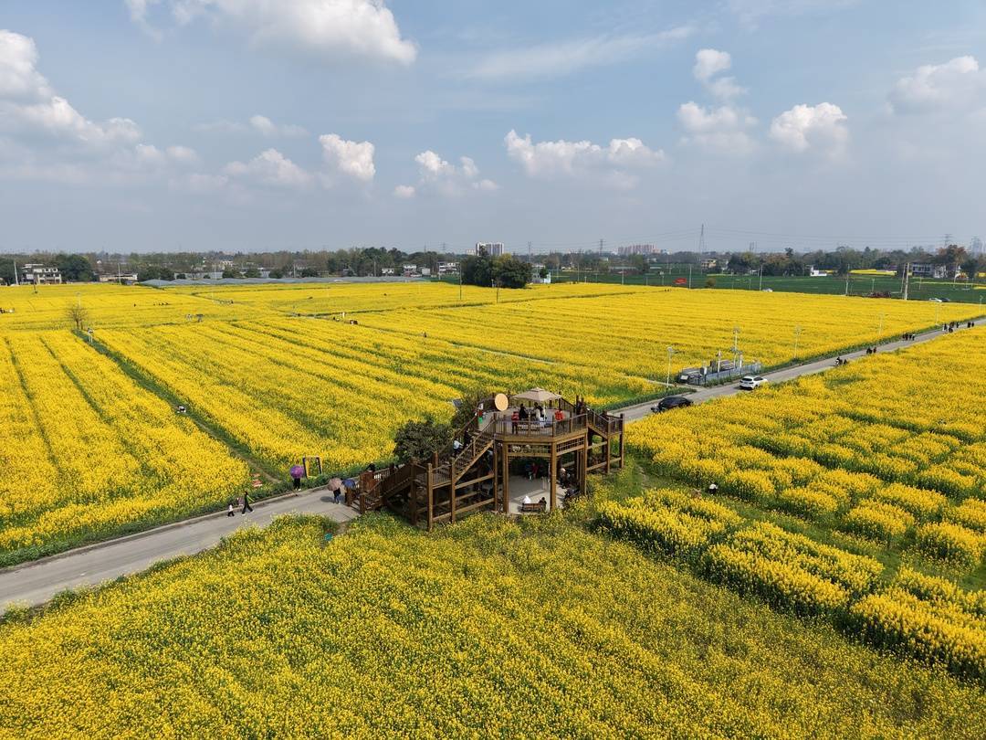 在东部新区养马街道,登上玻璃观景台,俯瞰壮美的“沱江第一湾”,在桃林间品尝花田火锅;在新都军屯镇,千亩油菜花海里支起了露营帐篷,川剧变脸在花影中上演;在双流兴海花卉产业园,3300亩“花卉王国”里不仅能赏花,还能买花、种花、品花。