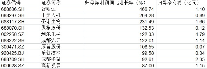 纵横股份、利尔化学、成都先导、厚普股份等则暂列四川上市公司归母净利润增幅榜第四位至第七位,同比增幅分别为132.53%、122.33%、122.01%和108.55%。