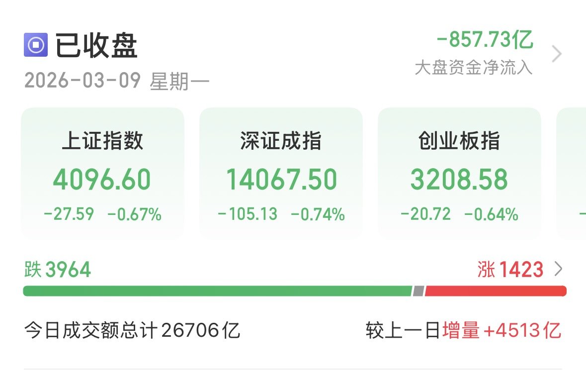 3月9日,A股三大指数宽幅震荡,沪指盘中跌幅一度接近2%,深证成指与创业板指跌幅一度超过3%。截至收盘,沪指跌0.67%,收报4096.60点;深证成指跌0.74%,收报14067.50点;创业板指跌0.64%,收报3208.58点。沪深京三市成交额达到2.67万亿元,较上一交易日放量4513亿元。个股整体跟随大盘走弱,近4000只个股下跌,1423只个股上涨。