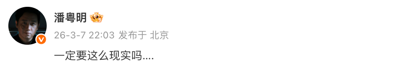 3月7日晚,潘粤明深夜发文:一定要这么现实吗...引发网友热议。