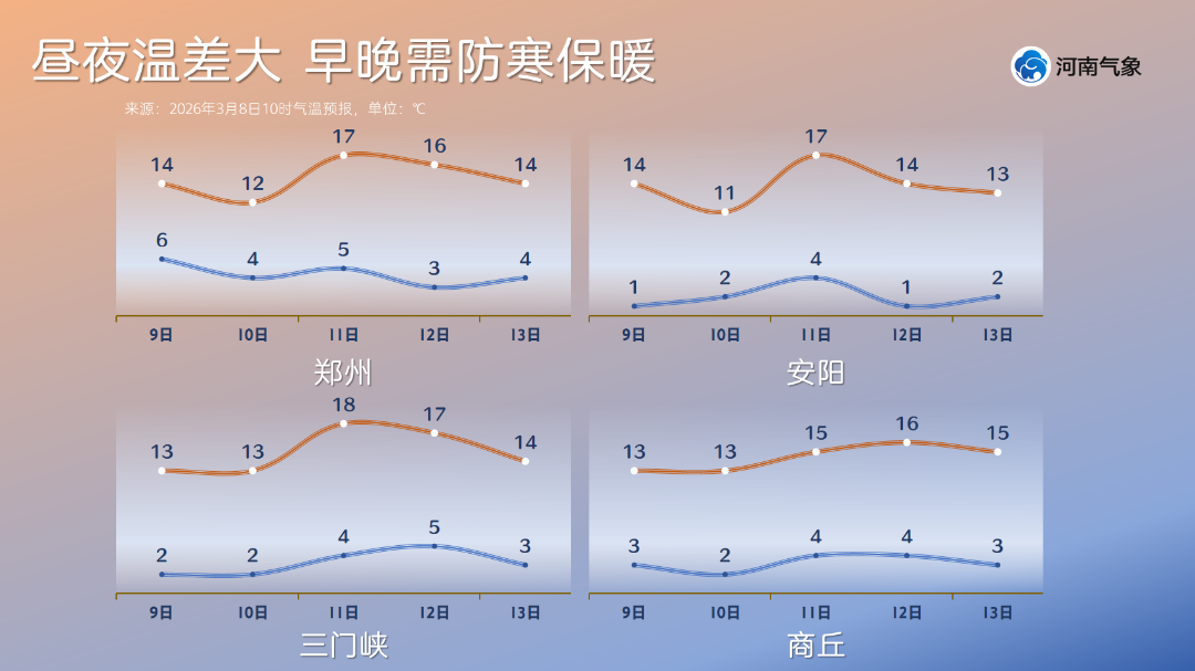 然而,升温并不意味着可以立刻换上春装。昼夜温差,是未来几天天气最需要关注的重点。我省大部分地区最低气温仍在4-6℃之间,昼夜温差普遍超过10℃。以省会郑州为例,未来五天最大温差可达13℃。这意味着,清晨和傍晚时分寒意依然显著,厚衣服暂时还不能收起来。