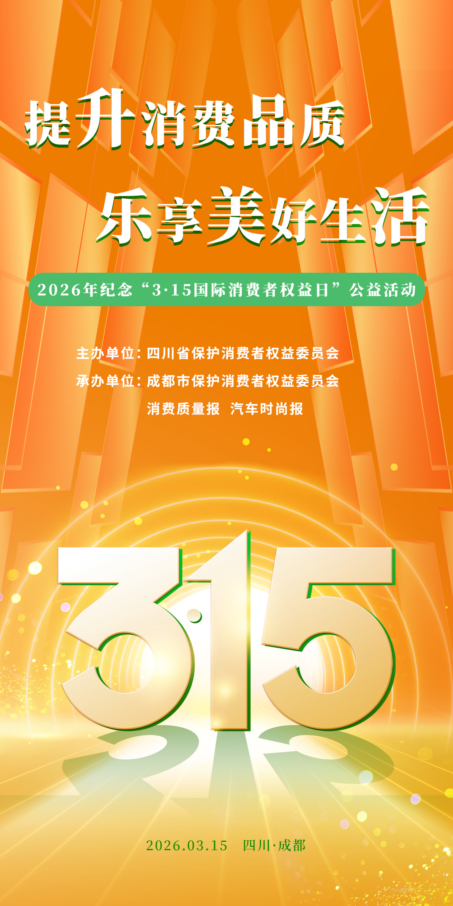 一年一度的“3·15国际消费者权益日”即将到来。3月15日,由四川省保护消费者权益委员会主办,成都市保护消费者权益委员会、消费质量报、汽车时尚报承办的2026年纪念“3·15国际消费者权益日”公益活动将在成都高新区保利·时光里举行。