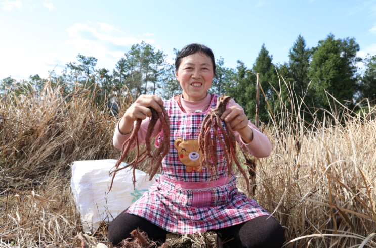 “你看这株,去年天干还长了11根,断了两根,算上一共13根!”高林华随手拿起一株刚挖起的丹参,朱红色的根须饱满壮实,语气里满是自豪,“平均每株能长七八根到十几根,产量稳得很!”