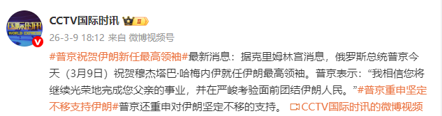 据克里姆林宫消息,俄罗斯总统普京今天(3月9日)祝贺穆杰塔巴·哈梅内伊就任伊朗最高领袖。普京表示:“我相信您将继续光荣地完成您父亲的事业,并在严峻考验面前团结伊朗人民。”