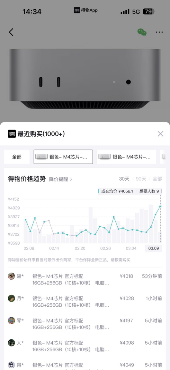 同时本地化部署带动了主机的销量激增,“龙虾热”带火苹果Mac Mini M4,近一周价格逆势增长近650元一机难求,引发消费者抢购潮,产品在官网等渠道已售罄。得物App数据显示,Mac Mini M4 16GB+512GB版本最新成交价由4950上涨至5599元,价格上涨649元(13%);Mac Mini M4 16GB+256GB版本最新成交价由3751元上涨至4058元,价格上涨307元(8%);配置更高的Mac Mini M4 Pro 24GB+1TB版本最新成交价为9999元,近1个月价格上涨了1900元(23%)。
