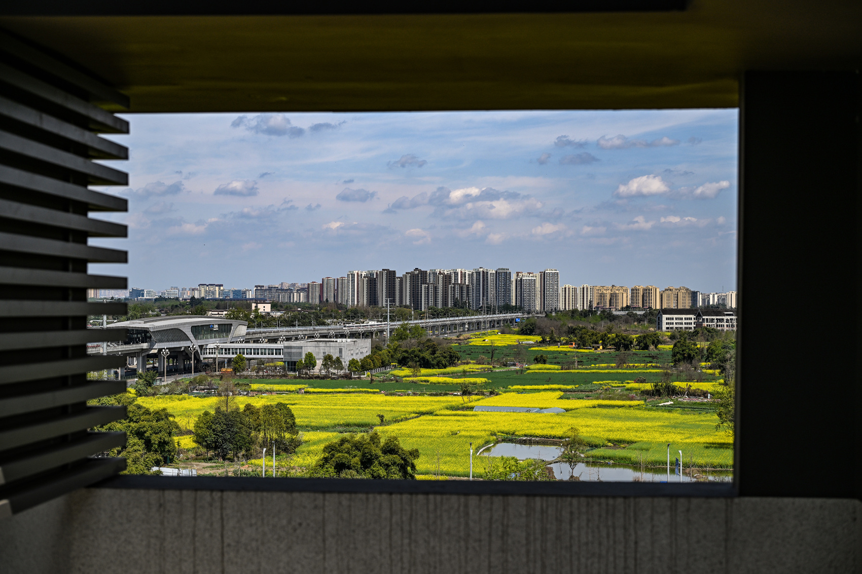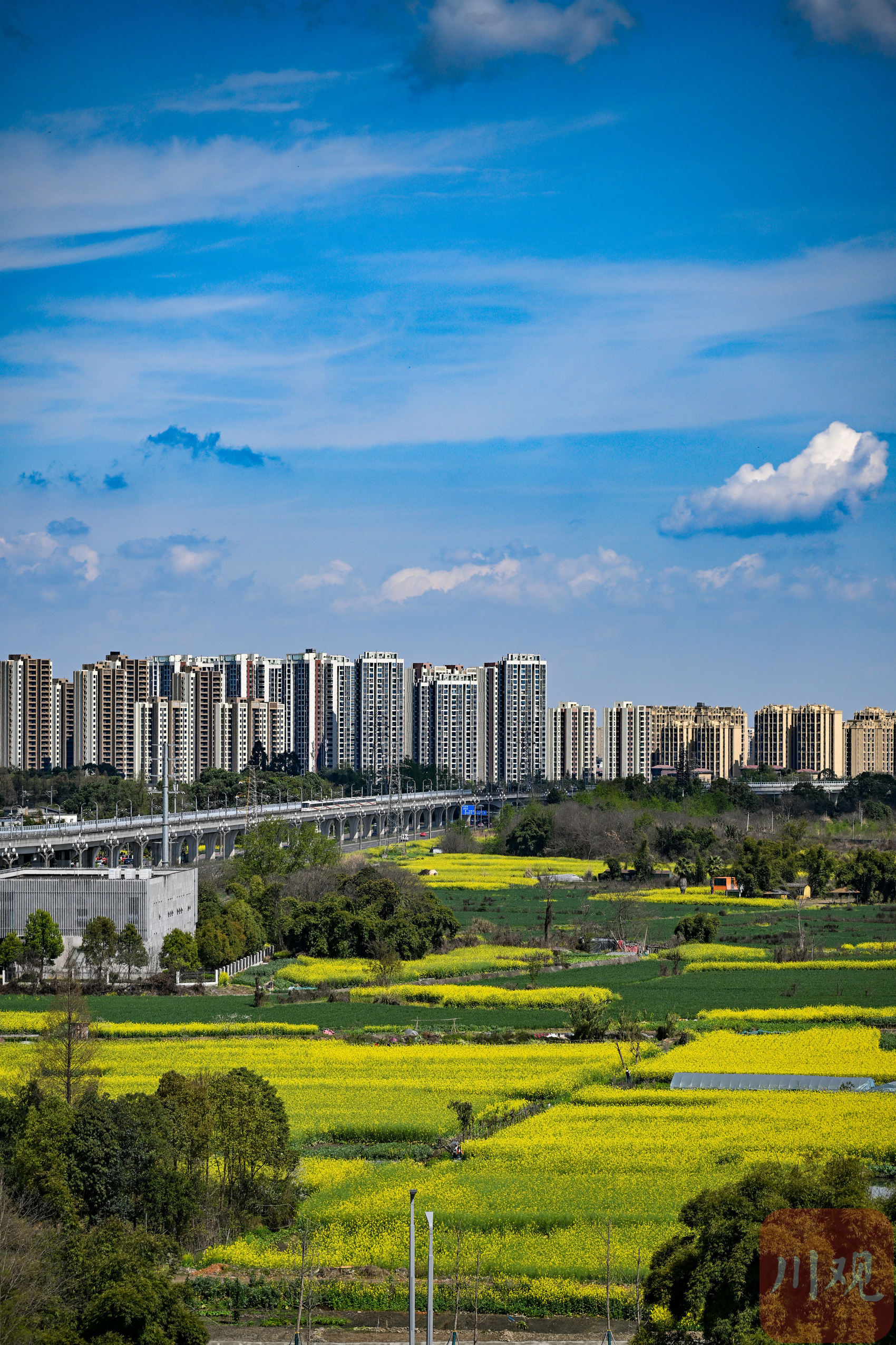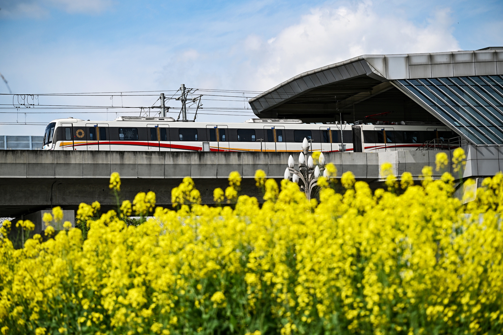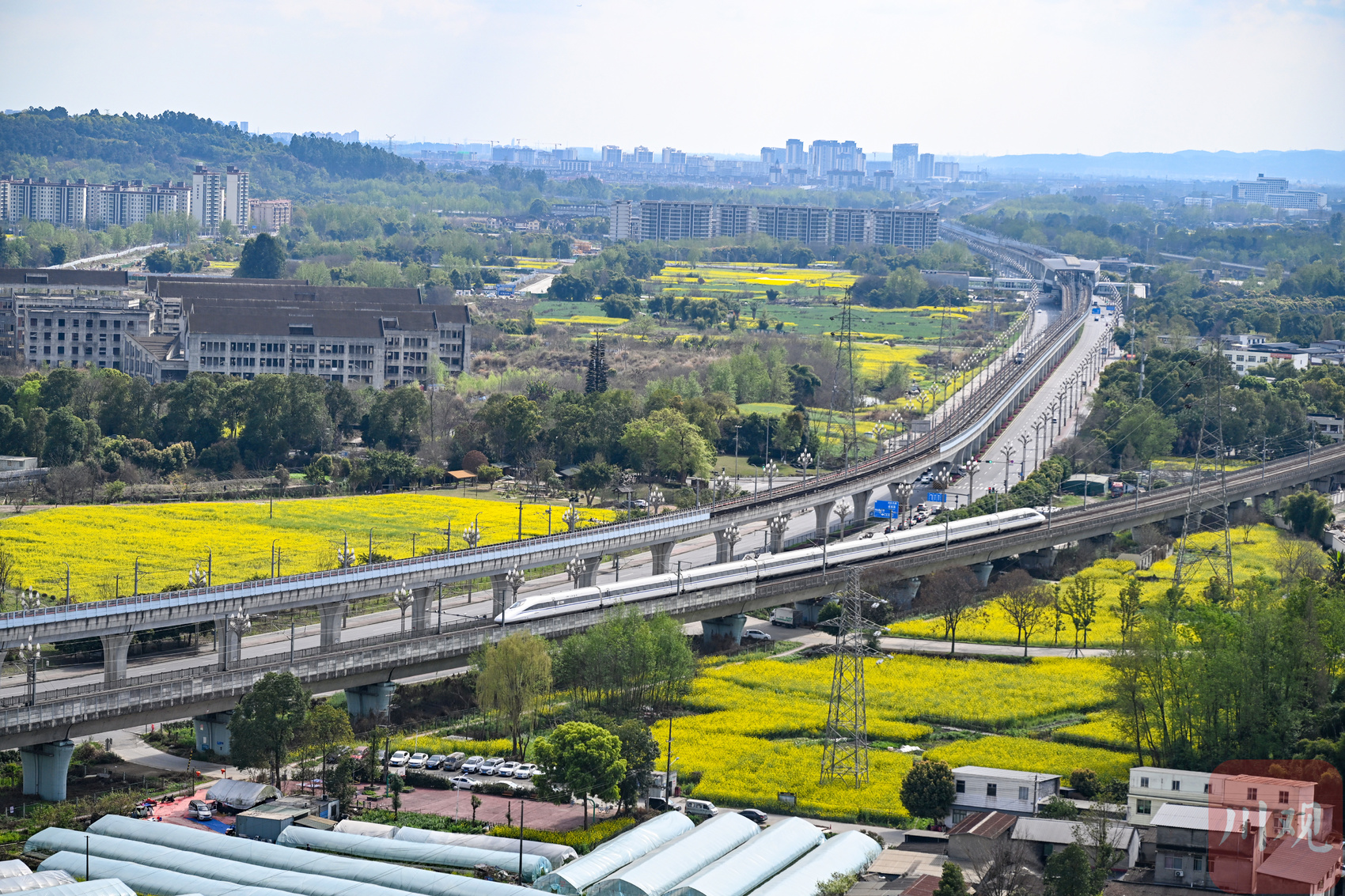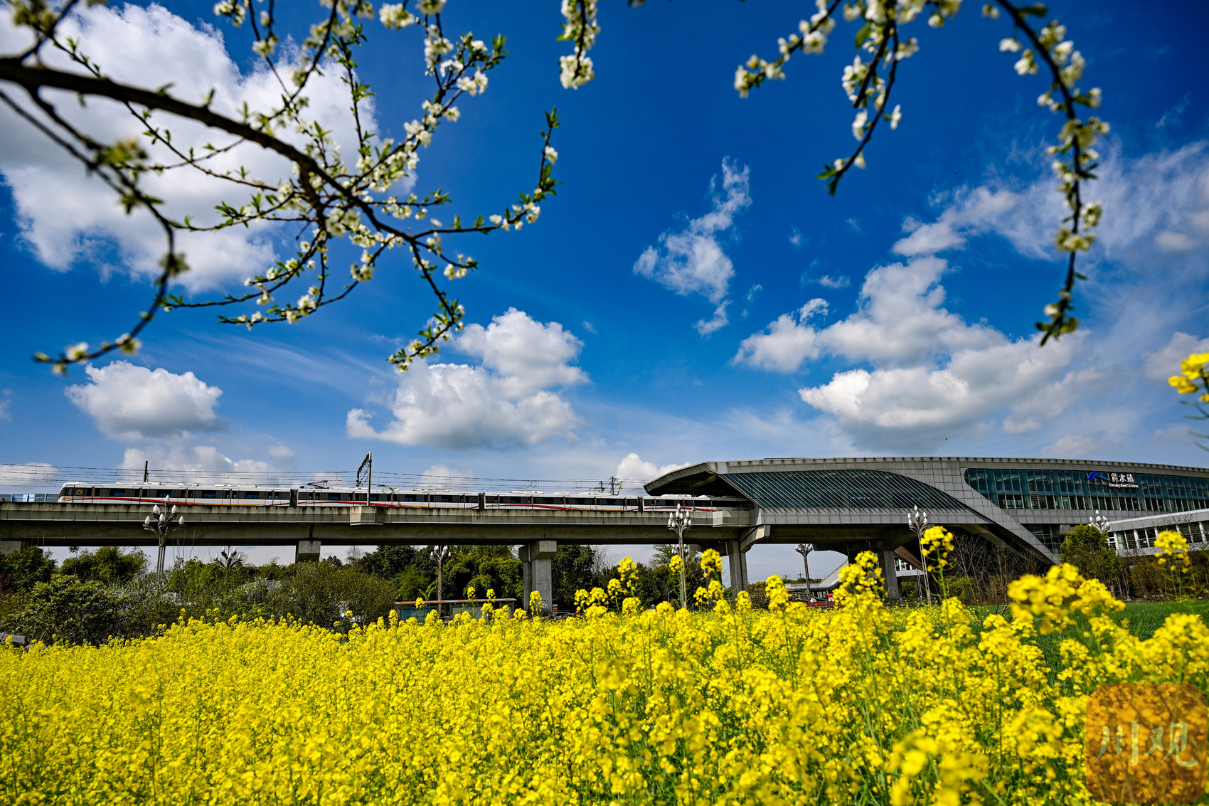 记者在现场看到,黄水镇的油菜花海次第绽放,一列列动车、地铁穿梭于金色花浪间,现代交通与田园春色相映成趣,尽显春日的清新与活力,一派生机勃发的春日景象。