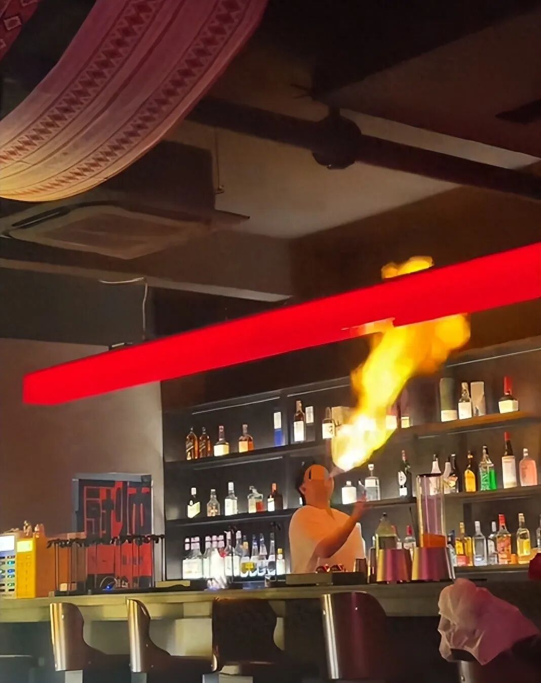 2025年9月,一位辽宁网友发布视频,铁岭一家酒吧疑似调酒师在吧台进行喷火表演失误。