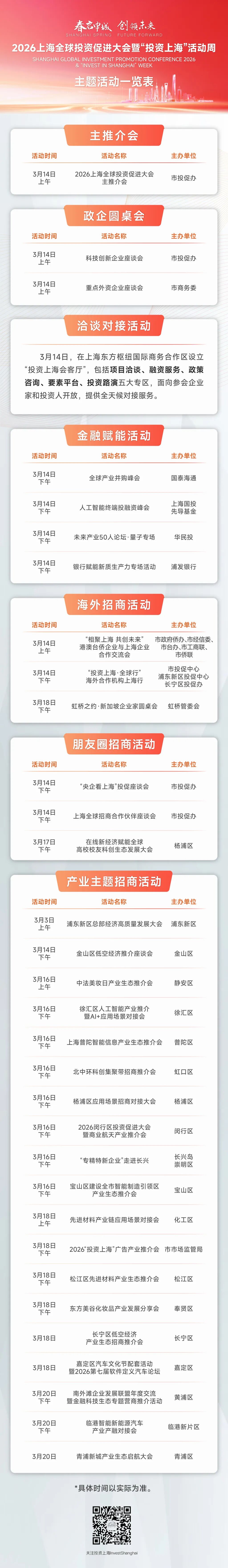 2026上海全球投资促进大会以“春启申城·创领未来”为主题,将于3月14日上午在东方枢纽商合区开幕并举办主推介会。同步启动“投资上海”活动周,开展“1+2+N+X”系列活动,即1场高规格主推介会、2场企业圆桌会、N场洽谈对接活动、X场主题招商活动。