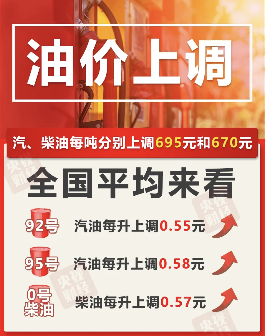 ▷9日24时起,国内汽柴油零售价格每吨分别上调695元、670元,全国平均来看:92号汽油、95号汽油、0号柴油分别上调0.55元、0.58元、0.57元。