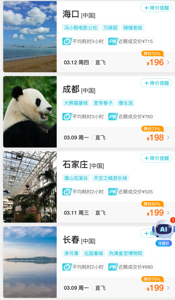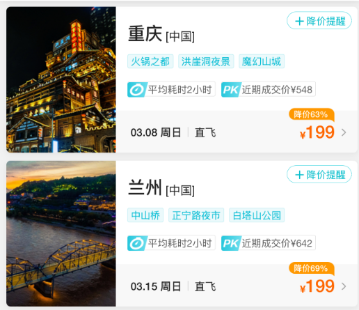 成都等地的机票价格