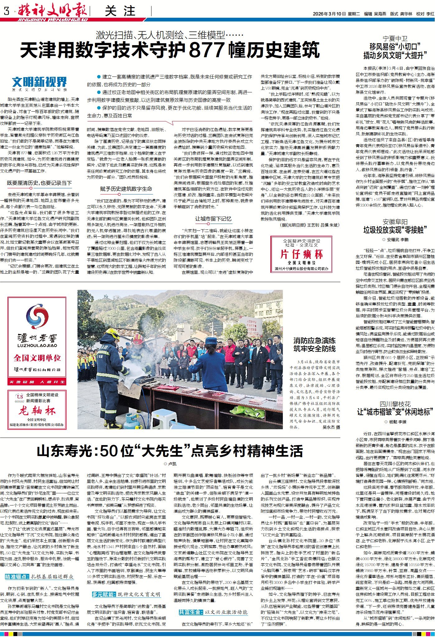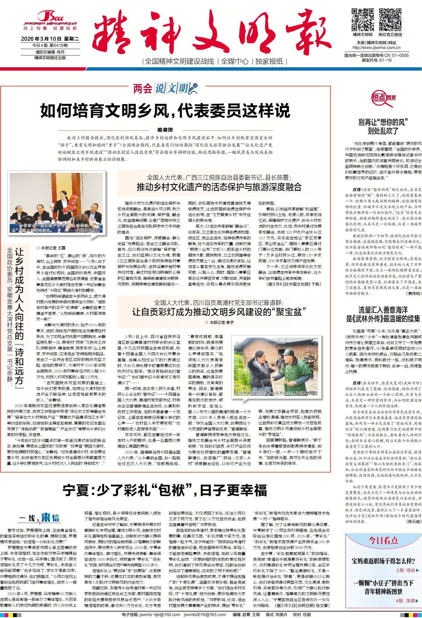 如何让乡村既有宜居宜业的“面子”,更有文明和谐的“里子”?全国两会期间,代表委员们纷纷围绕“深化农文旅等融合发展”“让文化遗产更好地赋能文明乡风建设”“推动农村匠人技能变现”等话题分享调研经验,畅谈思路举措,一幅风景美与风尚美相协调的和美乡村新画卷正徐徐铺展。请关注今日1版《两会说文明》栏目。