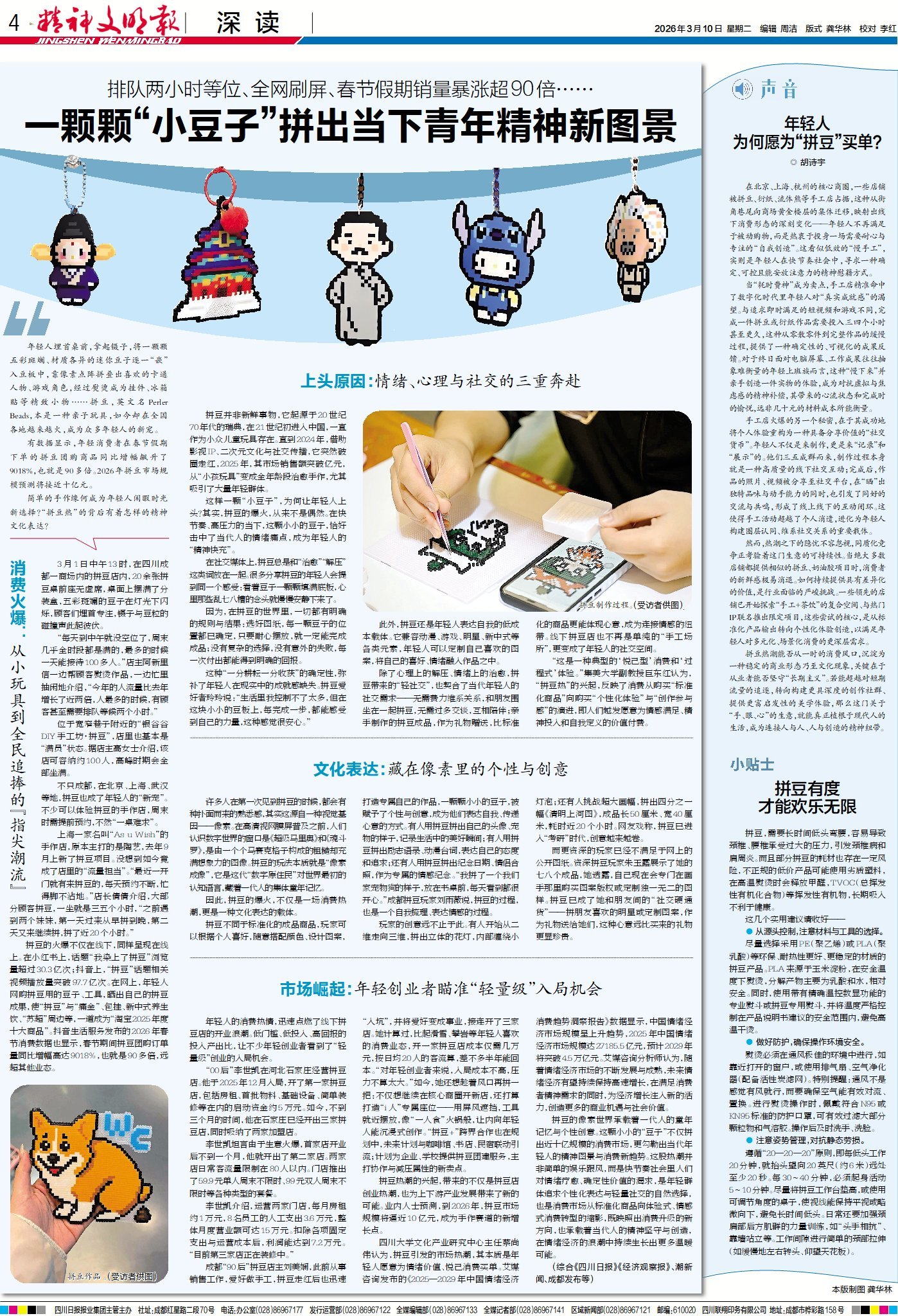 排队两小时等座位,全网刷屏,春节假期销量暴涨90倍……拼豆,本是一种亲子玩具,如今却在全国各地越来越火,成为众多年轻人的“新宠”。这颗“小豆子”缘何成为年轻人闲暇时光的新选择?“拼豆热”的背后有着怎样的精神文化表达?今日4版“深读”带你看《一颗颗“小豆子”拼出当下青年精神新图景》。