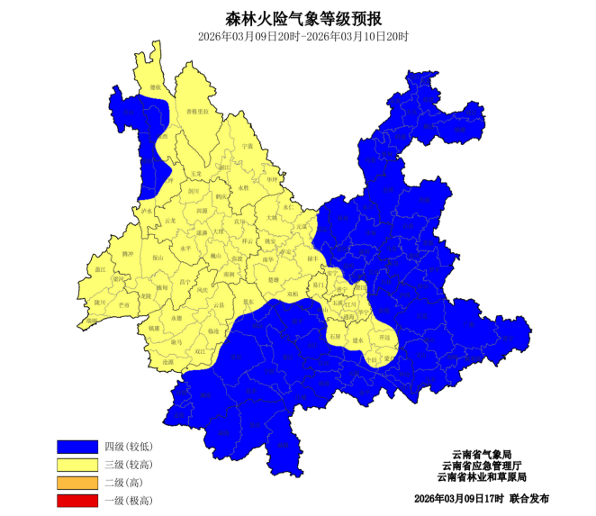 2026年3月9日20时至2026年3月10日20时,迪庆州、怒江州东部和南部、丽江市、大理州、楚雄州、保山市、德宏州、临沧市、普洱市北部、昆明市西南部、玉溪市中部、红河州中部三级(较高),其他地区四级(较低)。