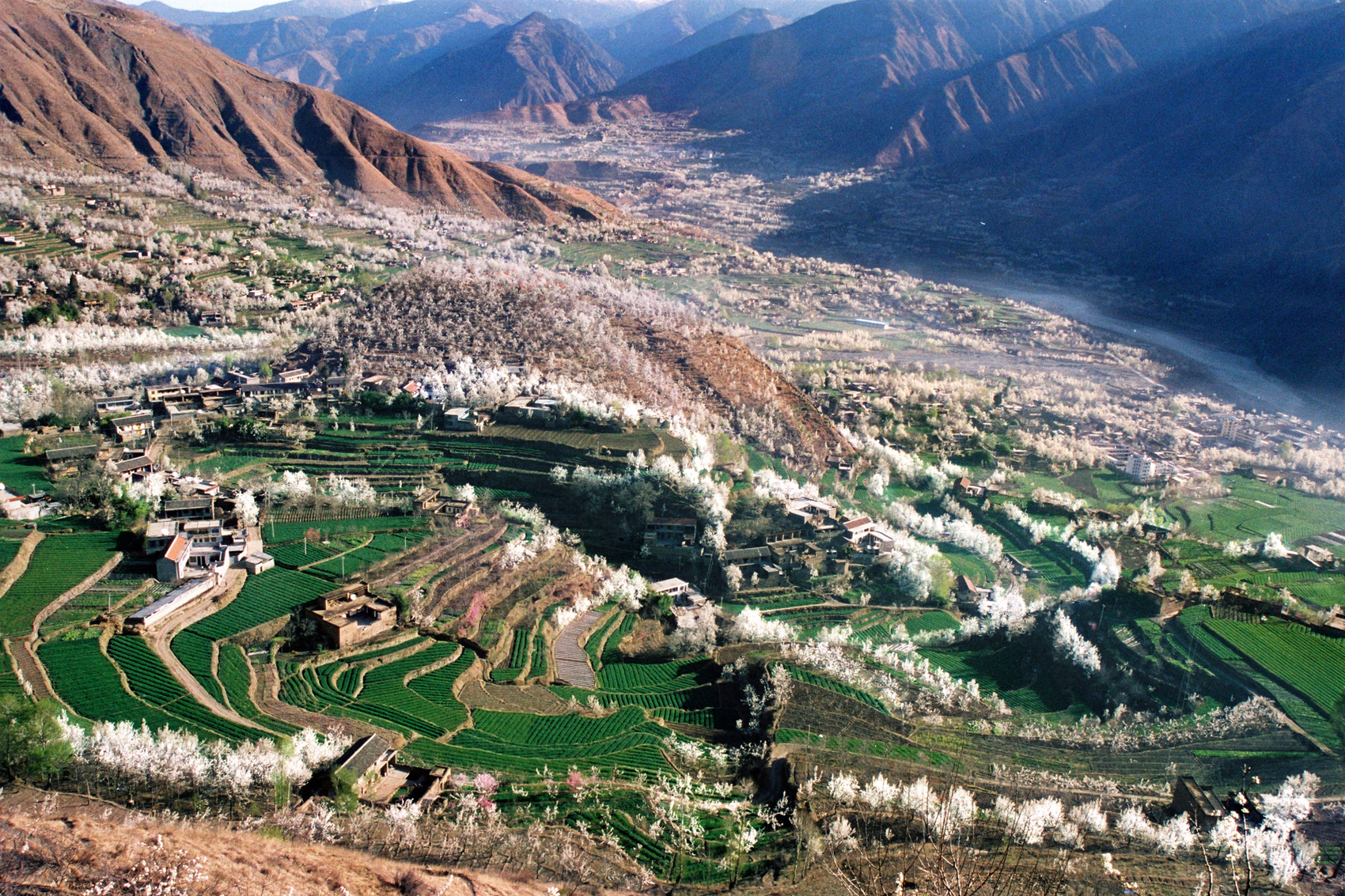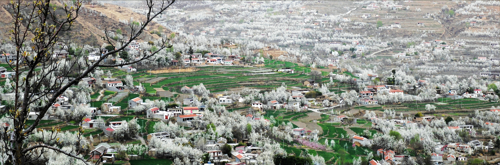 每到3月,在金川,雪山脚下、河谷之间,成片梨花铺满山坡,蓝天白云、麦田村庄、藏寨碉楼交织在一起,一幅“云上新江南・醉美梨花源”的绝美图景。