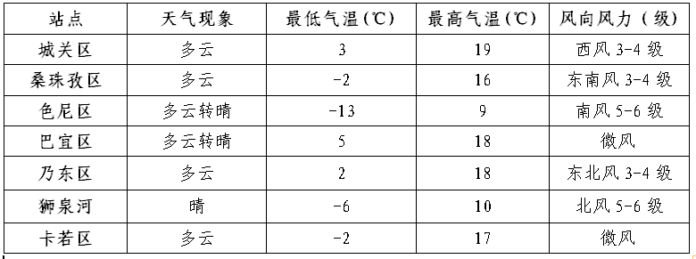 明天白天: 林芝、昌都、山南南部和日喀则南部多云间阴天,部分地方有分散性阵雪(雨);其他地方少云间多云。那曲、阿里、山南南部、日喀则西部和南部有7级左右大风。