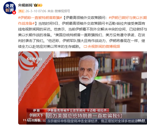 据@央视新闻报道,当地时间9日,伊朗最高领袖外交政策顾问卡迈勒·哈拉齐接受美国有线电视新闻网的采访。他表示,当前伊朗看不到外交解决冲突的空间,已经做好与美以长期作战的准备。“美国总统特朗普一直欺骗我们,美方没有遵守承诺,在谈判时袭击了我们。”他还称,伊朗军队强大且有作战动力,伊朗将像现在一样,继续全力以赴地应对美以带来的生存威胁。