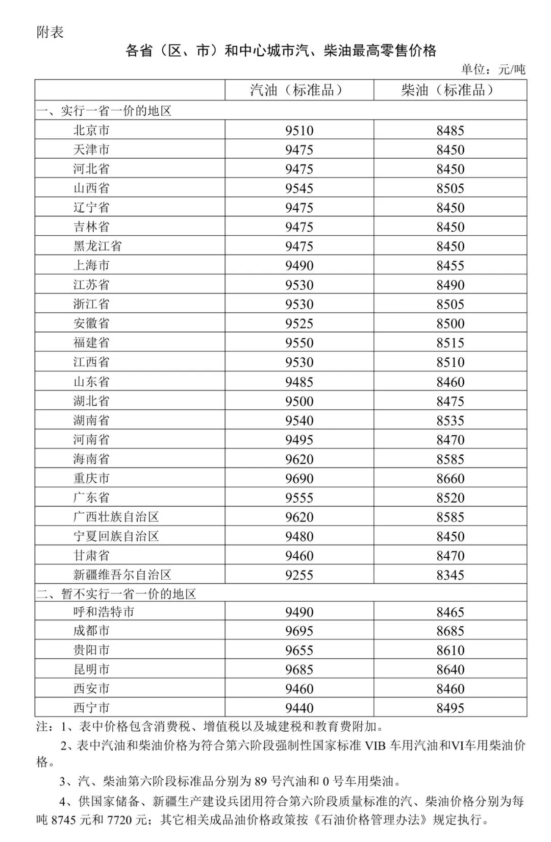 附:各省(区、市)和中心城市汽、柴油最高零售价格