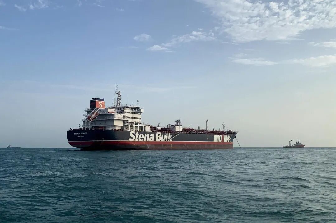 这是在霍尔木兹海峡附近拍摄的一艘油轮。