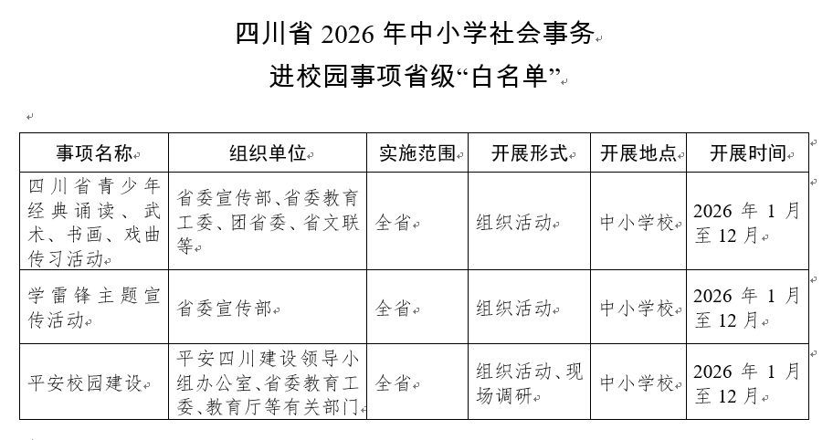 省教育厅要求,各市(州)、县(市、区)须严格按照社会事务进校园准入标准制定本级2026年度社会事务进校园事项白名单,每所学校每学期各类进校园活动不超过6次。