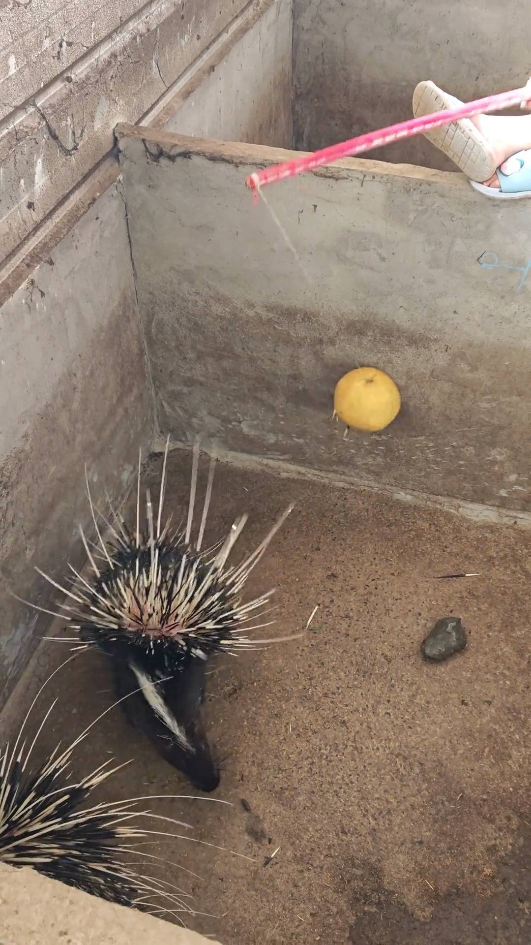 后来,有网友在评论区脑洞大开,想看看豪猪遇到袭击时是否会主动射刺。为了满足网友的好奇心,余千平开始尝试用各种新奇方式“拔刺”。比如在木棍上套一根线,线的另一端绑上柚子,将柚子靠近豪猪背部,很快就有几根刺射进柚子里。