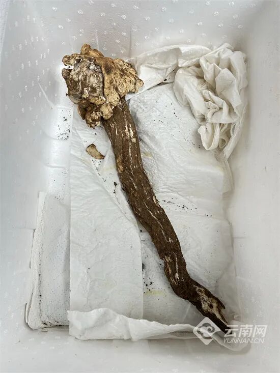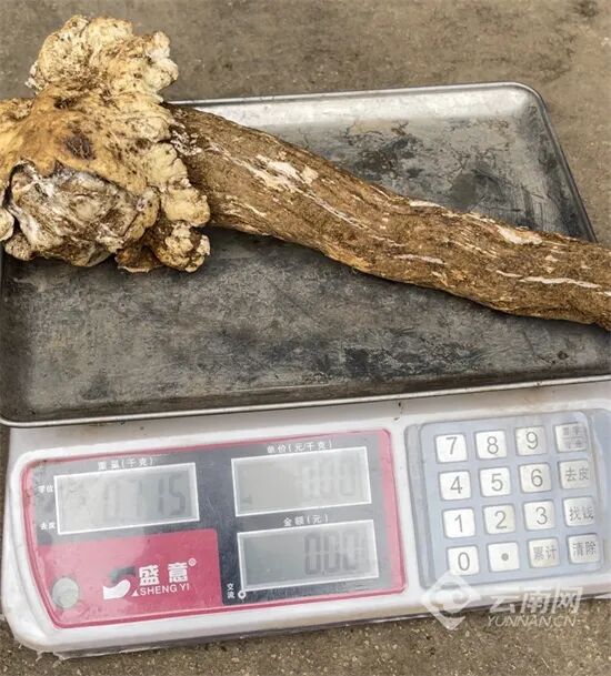 “这朵鸡枞重715克,全长50公分左右,肉质非常紧实。”云南木水花野生菌交易中心商户陶子介绍,这朵鸡枞是在曲靖一个果园中被发现的,挖出后第一时间就被送到了市场。鸡枞目前的售价是2600元一公斤,已经有不少顾客前来围观询价。“可能因为缺水,导致菌帽长得有点丑,但不影响它的鲜甜口感,非常适合炖鸡汤。”