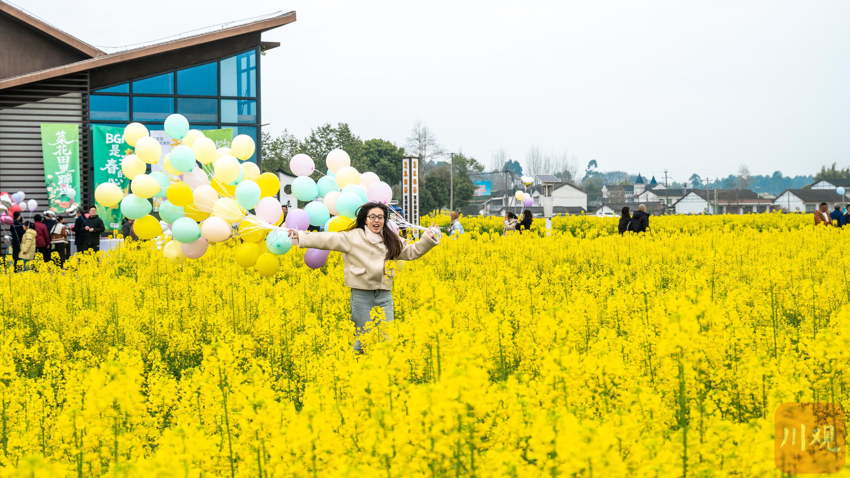 3月9日,成都双流区瞿上田园,游客在花海中打卡,古朴建筑掩映在金色油菜花间。C视觉签约摄影师 龚榜玉