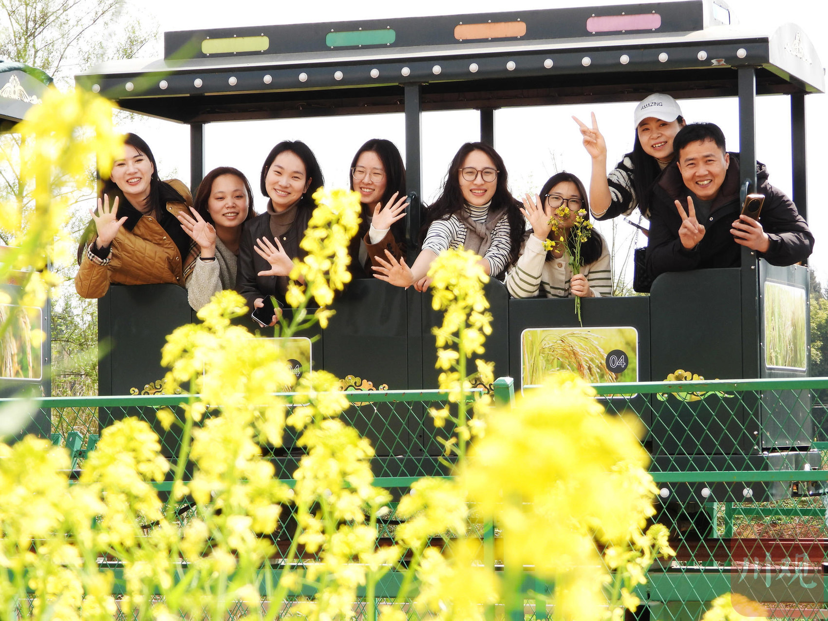 2026年3月9日,达州市渠县有庆镇太阳村花田景区,游客乘坐“小火车”观赏花海。C视觉签约摄影师 邓良奎