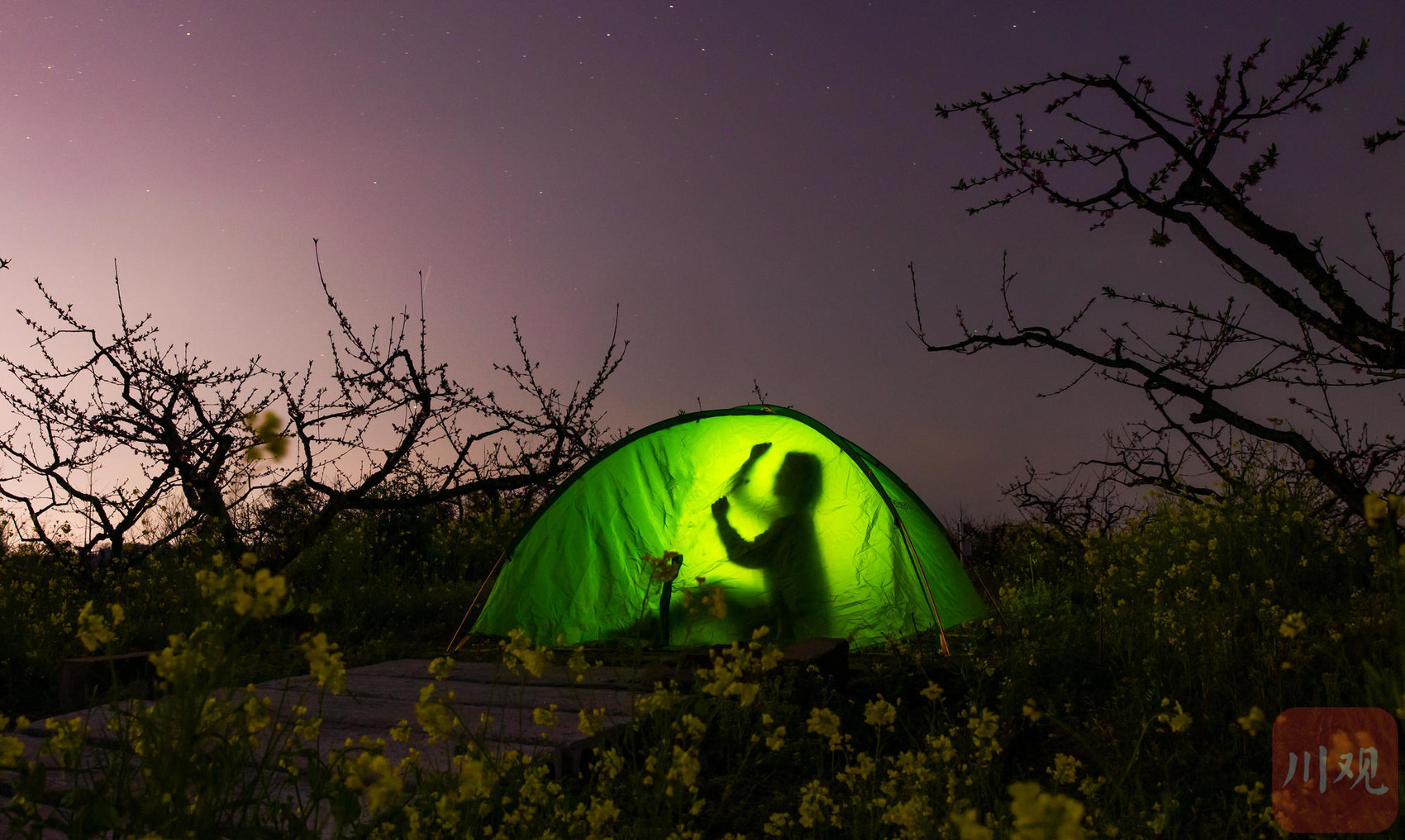 3月9日,广安市广安区龙安乡大云山桃林,露营爱好者在桃花树下搭建帐篷,踏青赏春。C视觉签约摄影师 张晓