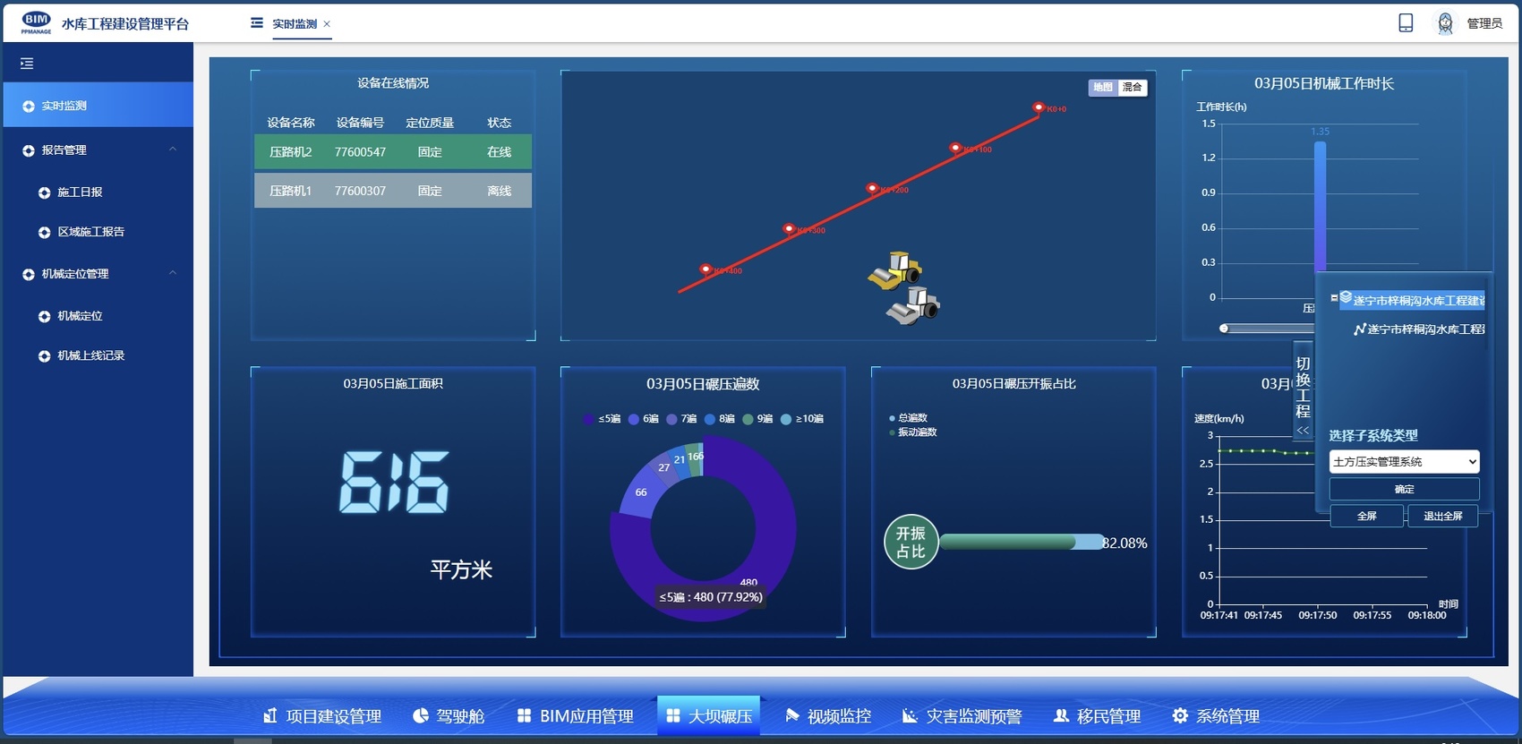 “数字孪生系统的核心价值,在于实现工程全生命周期的精准管控、高效运维。”工程相关负责人介绍,在建设阶段,该系统最直观的应用体现在大坝智能碾压环节——施工人员在压路机上安装GPS定位与数据监测系统,可实时精准捕捉压路机的碾压压力、行驶速度、碾压遍数等核心参数,实现施工过程的实时监测、质量把控与效率提升。相较于传统人工监测模式,智能系统不仅有效节约了人力成本,更重要的是减少了人为检测的误差,让大坝施工质量保障水平大幅提升。