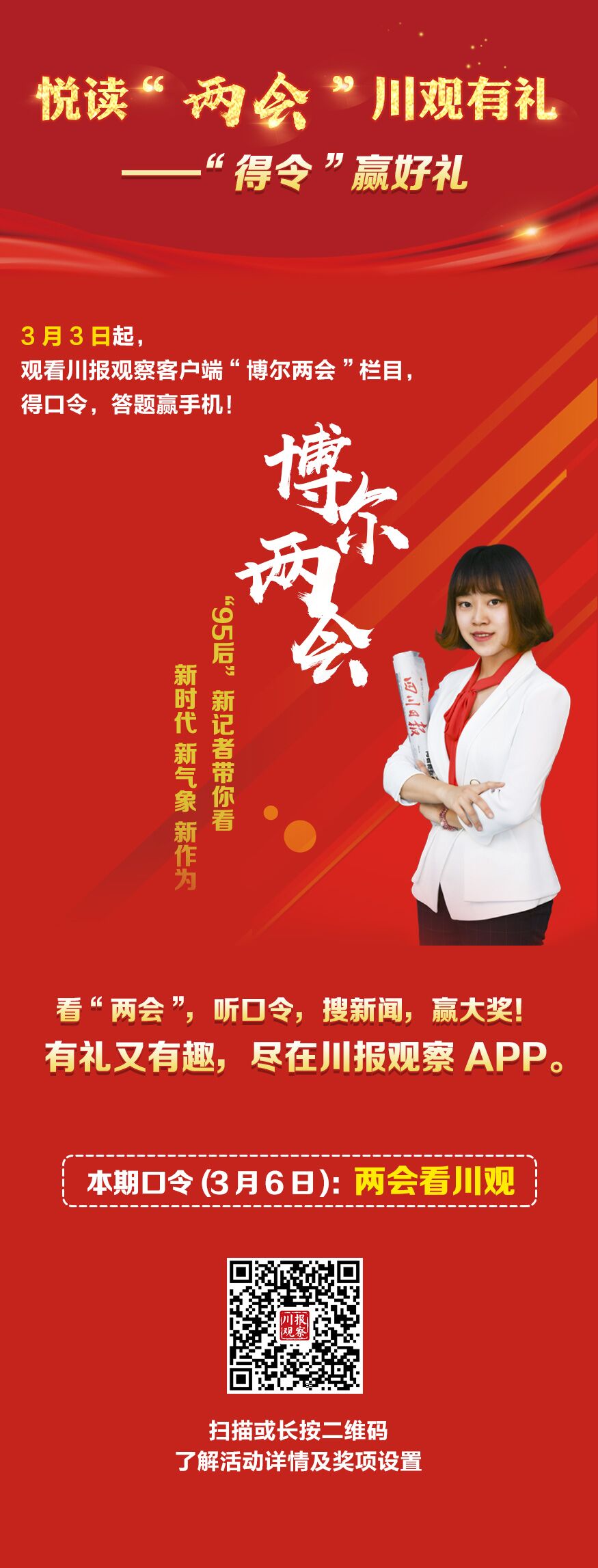 上川观,悦读“两会”,赢取大奖。关注“博尔两会”系列节目,获取主持人的提问和口令,通过在川报观察客户端搜索口令,寻找带有答案的文章并留言,即有机会获得川报观察送出的惊喜大奖。