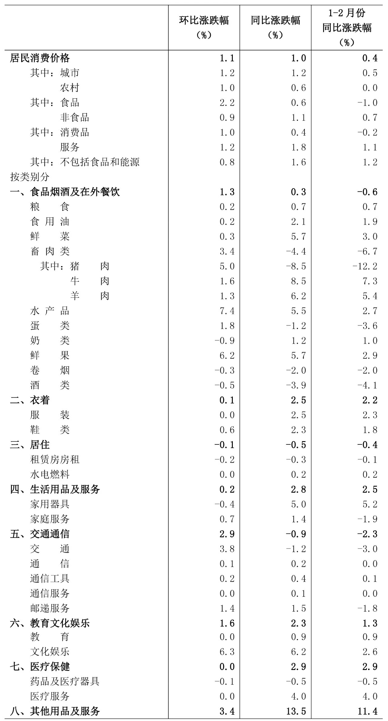 此外,受春节前后消费需求集中释放影响,“菜篮子”产品价格也有所上涨。2月份,猪肉价格环比上涨5%,鲜果价格环比上涨6.2%,鲜菜价格环比上涨0.3%。“鲜菜价格涨幅温和主要与近期气温偏暖有关,蔬菜生产形势良好。”上述负责人表示。