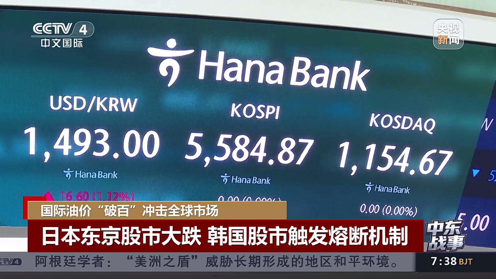 首先承压就是金融市场,受油价暴涨影响,3月9日亚太多地股市显著下跌。日本东京股市大幅走低,韩国主要股指更是因暴跌触发了“临时停牌”和熔断机制。