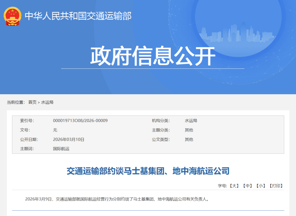 2026年3月9日,交通运输部就国际航运经营行为分别约谈了马士基集团、地中海航运公司有关负责人。