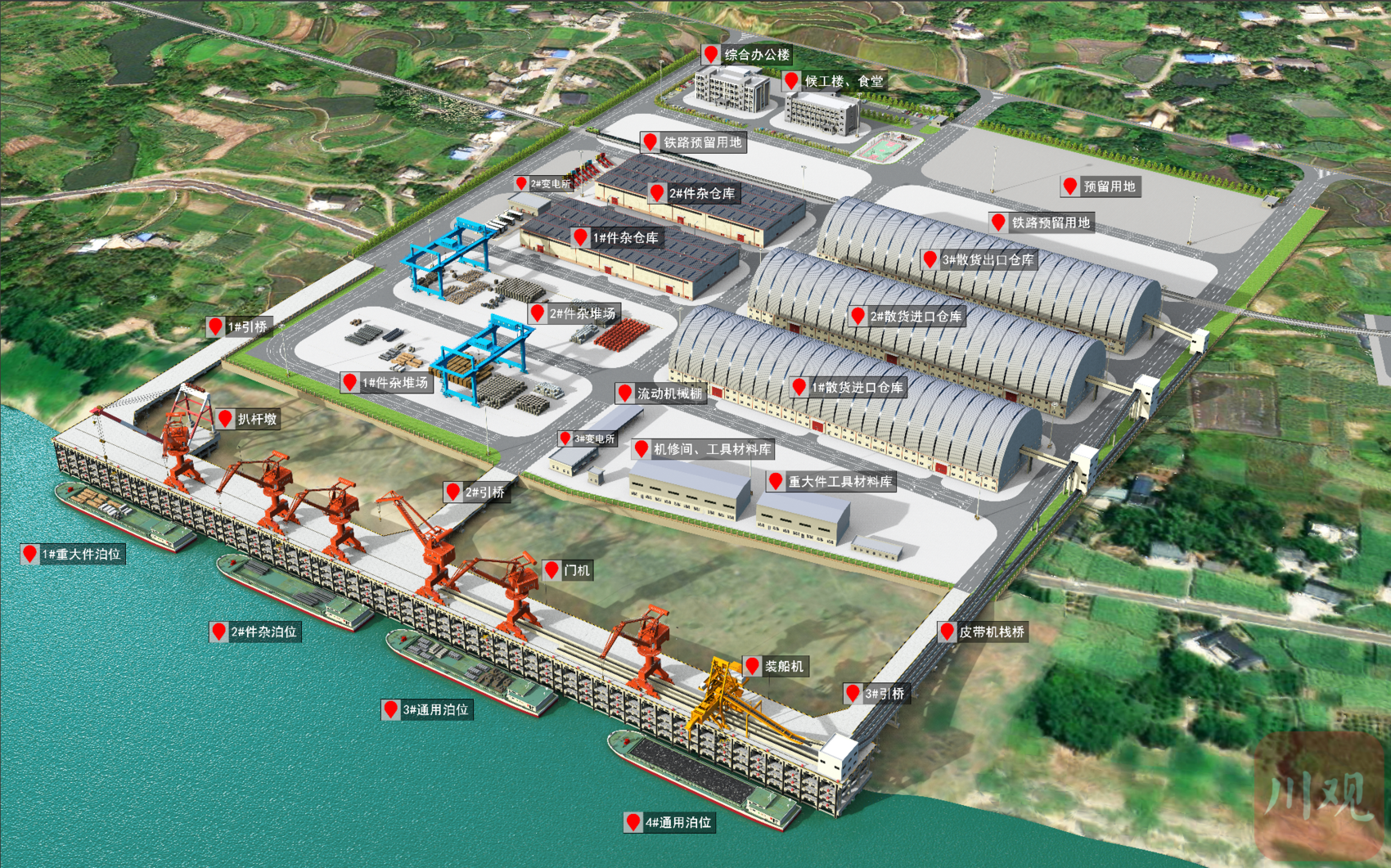 大脚石作业区是泸州江北港暨重装产业园的重要板块,一期工程占地398亩,计划投资超11亿元,将新建4个1000吨级泊位,设计年通过能力455万吨。