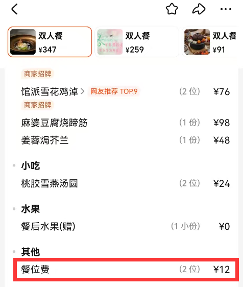 南堂馆·新川菜(IFS国金店)网上团购显示“餐位费”6元/人,包含在套餐内。