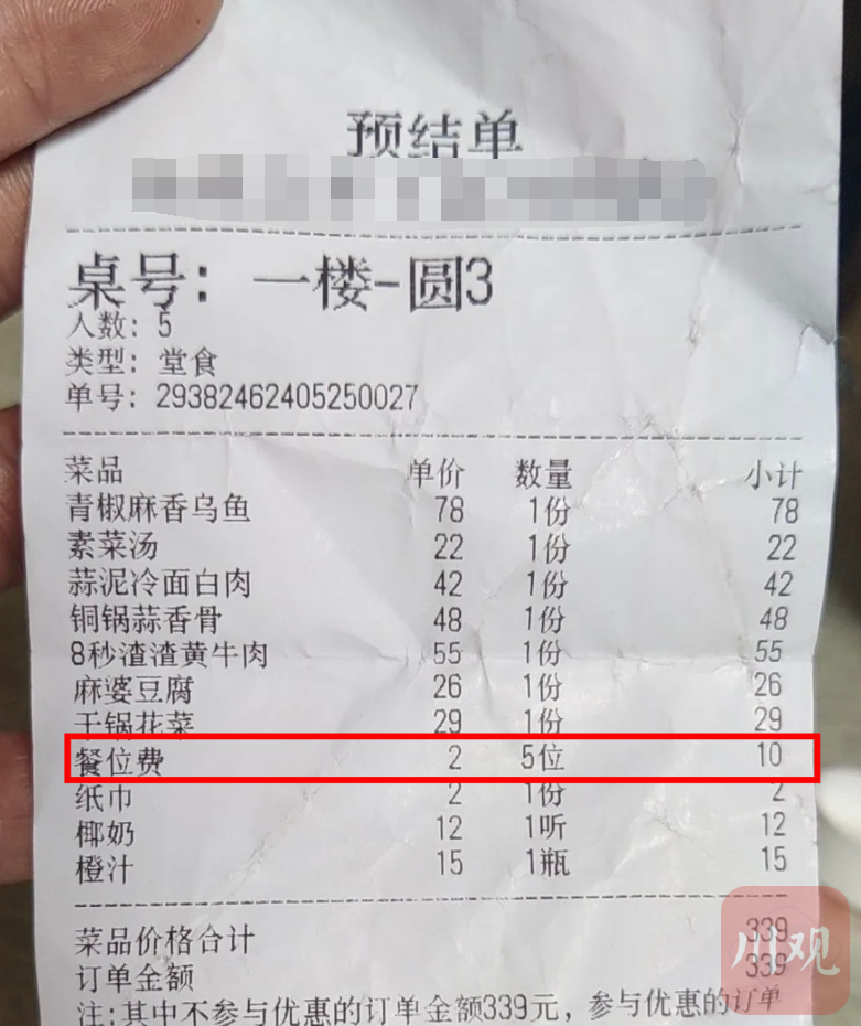 网友结账时发现有“餐位费”。图片来源:川观新闻